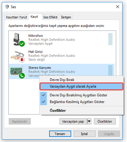 4- Son olarak tekrar Stereo Karışımına sağ klikleyerek Varsayılan Aygıt Olarak Ayarla deyin. Bu işlemlerden sonra mikrofon (ses kaydedicisi) tarafından kaydedilen sesler, bilgisayarınız tarafından üretilen orijinal sesler olacaktır. Bunun için herhangi bir mikrofona ihtiyacınız olmaz. Yani mikrofon olmadan da bilgisayar seslerini karşı tarafa gönderebilir veya kayıt edebilirsiniz.