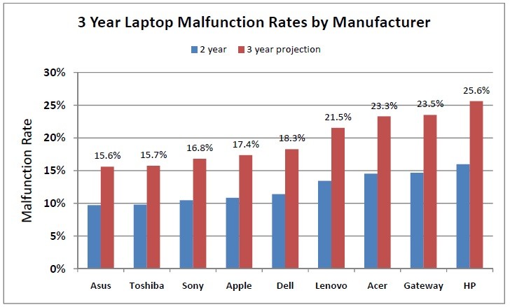 Şimdi sizlere yapılan araştırma sonucuna göre bir grafik göstereyim. Bu grafikte dünyada alındıktan 3 yıl sonra en az arıza yapan laptoplar listelenmiş. Bu grafiğe göre Asus, Toshiba, Sony, Apple ve Dell gibi markalar en az arıza yapma yüzdelerine sahip. Not: Diğer markaların çok arıza yaptığı anlamı çıkmasın.