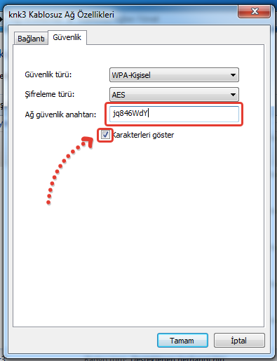 3- Açılan küçük panelde “Güvenlik” sekmesini seçip, “Karakerleri Göster” yanındaki kutucuğu seçili hale getiriyoruz ve “Ağ Güvenlik Anahtarı” görünür hale geliyor. Bu Ağ Güvenlik Anahtarı wifi şifremiz oluyor.
