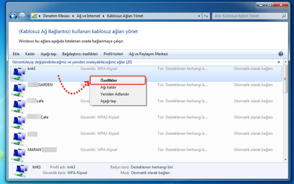 2- Karşımıza daha önce bu laptopdan bağlandığınız tüm wifi ağları gelecektir. Hangi Wifi ağına ait şifreyi öğrenmek istiyorsanız üzerine sağ klikleyip Özellikler diyoruz.