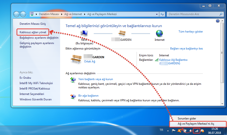 1- İlk olarak masaüstünde sağ altta bulunan bağlantı logosunu sağ klikleyip “Ağ ve Paylaşım Merkezini Aç” diyoruz. Açılan pencerede “Kablosuz Ağları Yönet” diyoruz.
