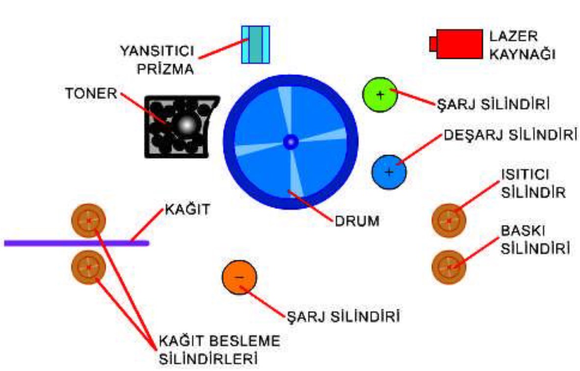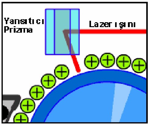 2- Drum üstündeki bazı noktalar lazer ışını tarafından eksi yükle yüklenir. Bu eksi yükler aslında kâğıda yazılacak olanların aynadaki bir görüntüsüdür.
