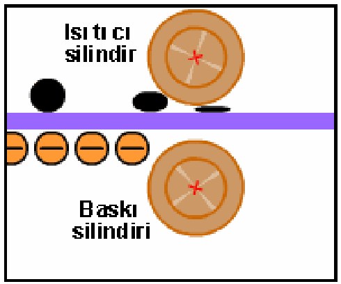5- Kâğıt ısıtıcı silindir ve baskı silindirinden geçerek dışarı çıkar. Bu iki silindirin arasından geçerken toner parçacıkları erir ve kâğıt üzerine iyice kalıcı olarak yapışır. Toner parçacıklarının erime sebebi içinde plastik madde olmasıdır.