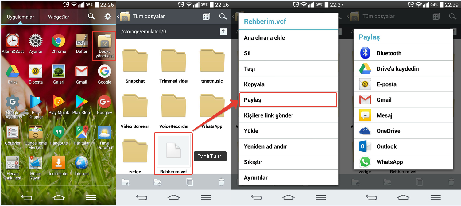 Yedeklediğimiz rehberimiz Uygulamalar > Dosya Yöneticisi adlı klasörde yer alıyor. Bunun içine girdiğimizde en altta isim verdiğimiz rehberimiz burada olacaktır. Burdan PAYLAŞ diyoruz. Bu kısımda istersek Bluetooth, Gmail, WhatsApp, Hotmail dilediğimiz yere, kişiye gönderbiliriz.