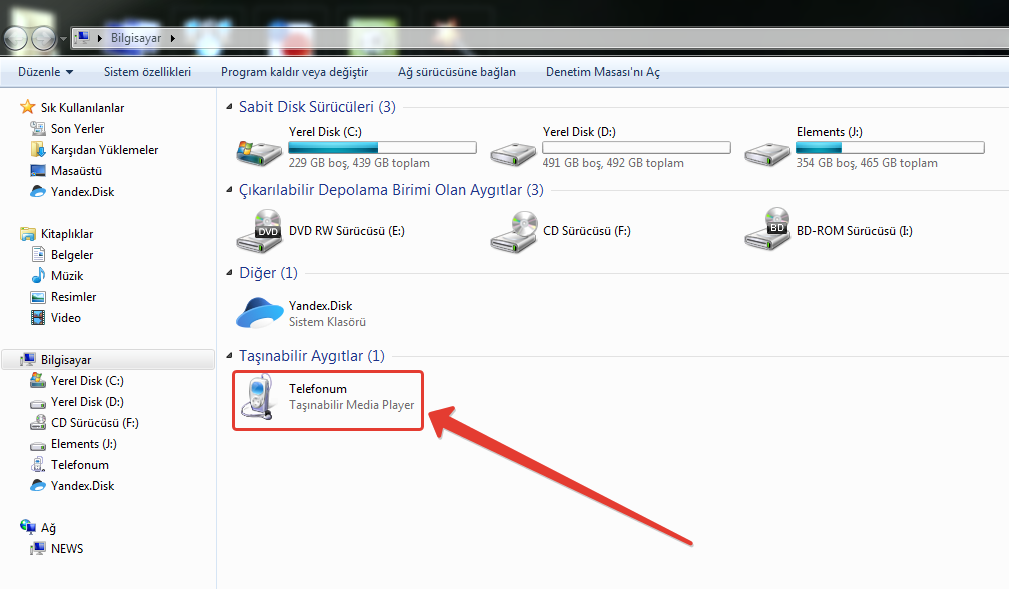 Yok ben rehberi bilgisayara keydetmek istiyorum diyorsanız o zaman USB kablosu ile telefonu bilgisayara bağlayın. Ardından masaüstünden bilgisayarım kısmına gelerek telefonun içine girin.