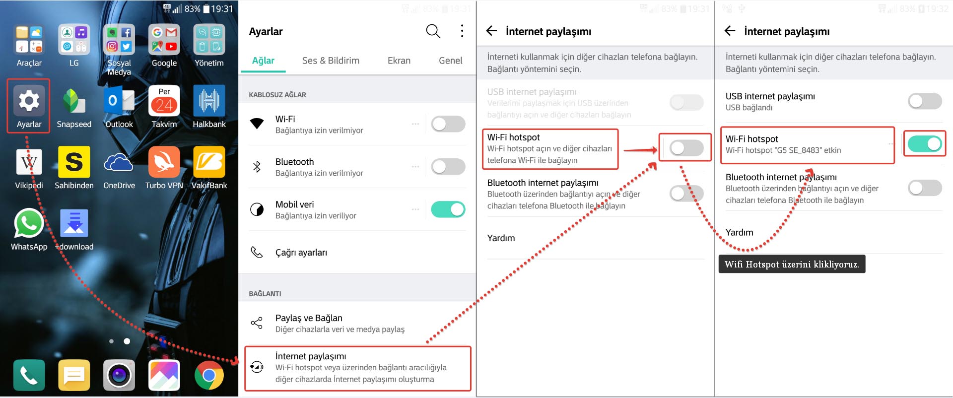 1- İlk olarak LG G5 telefonumuzun; Ayarlar >>> İnternet Paylaşımı >>> Wi-Fi Hotspot kısmına geliyoruz ve burdan Wi-Fi Hotspot tuşuna basarak aktif hale getiriyoruz. Burası önemli aktif hale getirme işleminden sonra wifi adı ve şifre ayarlamaları için bu kez Wi-Fi Hotspot kısmına klikliyoruz.