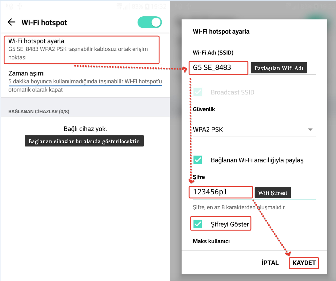 2- Karşımıza aşağıdaki gibi bir pencere gelecektir. Buradan Wi-Fi Hotspot Ayarla kısmını klikliyoruz. Açılan panelde isteğimize göre Wi-Fi Adı ve Şifre belirleyip KAYDET diyoruz. İşlem tamamsa karşıdaki kişiye bu bilgileri verip internetimizi kullanmasını sağlıyoruz.