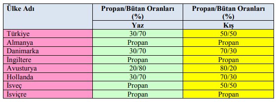 Türkiye’de kullanılan mix LPG’nin bileşimi genelde %70 bütan, %30 propan’dır. Ancak bazı firmalar oto gaz için kış mevsiminde bu oranı %50 propan ve %50 bütan olarak değiştirmektedirler. Avrupa’da pazarlanan LPG’nin içindeki propan oranı % 35 ila % 95 arasında değişmektedir.