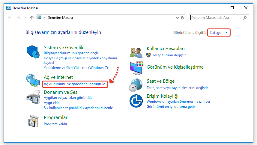 1- Bilgisayarımızdan “Başlat” kısmını kullanarak veya başlat kısmının bulunduğu alandaki arama kısmına “Denetim Masası” yazarak “Denetim Masasını” açıyoruz. Buradan “Ağ Durumunu ve Görevlerini Görüntüle” sekmesini seçiyoruz.