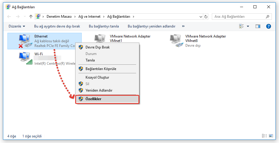 3- Gelen sayfadan üzerinde “Ethernet” yazılı olan ağı sağ klikleyip “Özellikler” diyoruz.