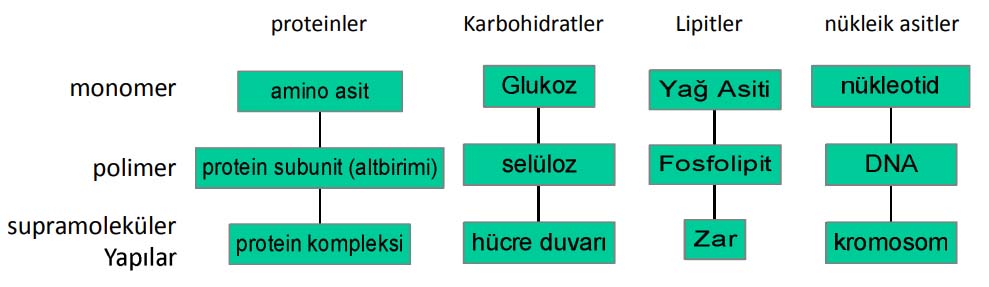 Makromolekül, küçük yapıtaşlarının yani monomerlerin polimerleşmesiyle (kovalent bağ ile bağlanmasıyla) oluşmuş çok büyük moleküler yapılardır. Örneğin; amino asitlerin polimerleşmesiyle proteinler oluşurken; şeker, fosfat asidi ve azot içeren heterosiklik baz (purin/pirimidin) polimerleşmesiyle nükleik asitler oluşur.