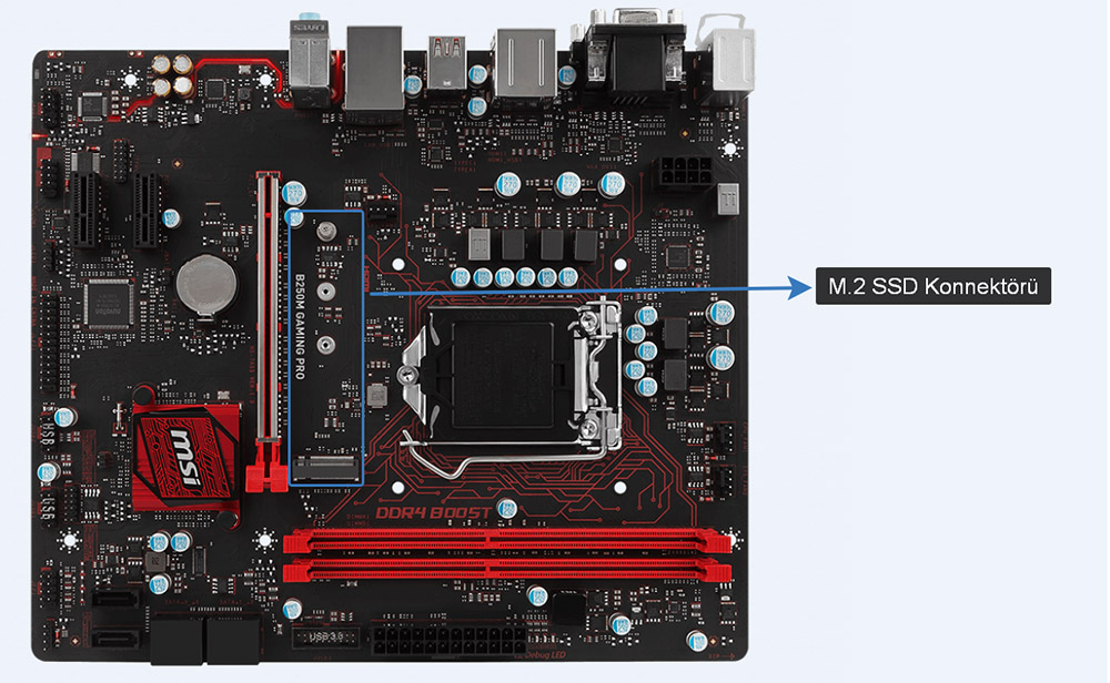Buradaki püf nokta şu! Eğer anakartınız üzerinde M.2 SSD Konnektörü/Soketi varsa M.2 SATA SSD mi yoksa M.2 PCI Express NVMe SSD mi desteklediğini öğrenmeniz gerekiyor. Bunu kesinlikle ama kesinlikle resmi sitesinden öğrenebilirsiniz. Başka bir yolu yok. Tabi elinizde iki tür SSD’de varsa bu şekilde deneme yanılma yoluyla da öğrenebilirsiniz. Bazı anakartların her iki türü destekleyebileceğini bazılarınınsa sadece bir türü destekleyebileceğini unutmayın. Mesela üstteki anakart modeli şu anda kullandığım MSI B250M Gaming Pro modeli. Bu model -yeni nesil bir anakart olduğu için- M.2 PCI Express NVMe SSD türlerini destekliyor.