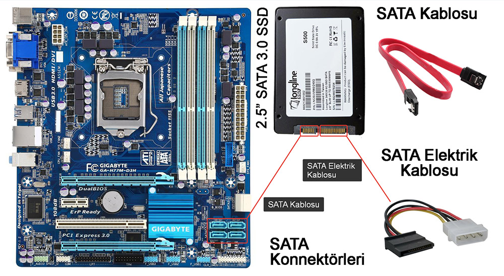 Eğer masaüstü bilgisayarınızda hali hazırda 2.5” veya 3.5” SATA HDD (Hardisk) varsa ki %99 ihtimalle vardır, yukarıda adı geçen üç SSD türünden 2.5” SATA 3.0 SSD’yi masaüstü bilgisayarınızın anakartına hemen bağlayıp çalıştırabilirsiniz. Bunun için anakartta kontrol etmeniz gereken yer hemen altta gördüğünüz bağlantılar.