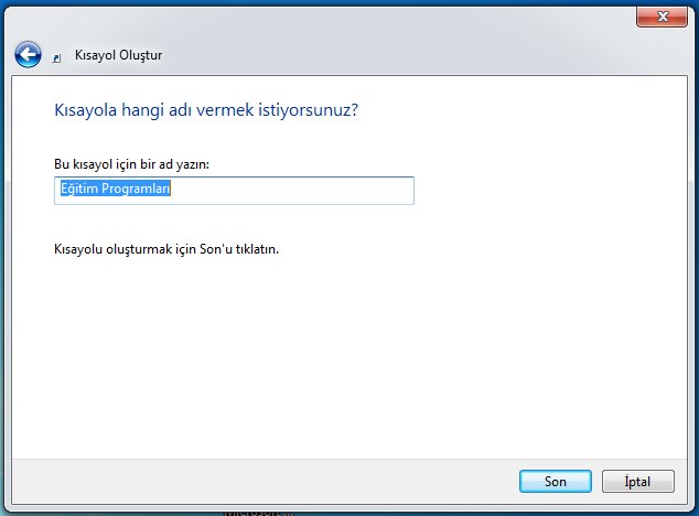 4- Bu kısımda dilerseniz masaüstünde oluşacak kısayola farklı bir isim verebilirsiniz. İsmi verdikten sonra Son diyoruz. Son dedikten sonra masaüstünde klasör kısayolumuz oluşacaktır.