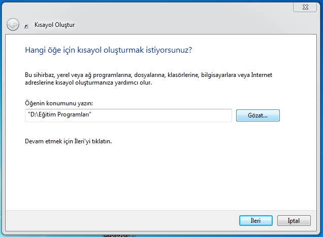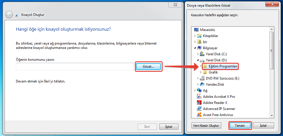 2- Açılan pencerede “Gözat” kısmından hangi klasörü kısayol olarak göstermek istiyorsak onu bulup seçiyoruz. Alt klasörleri de bu şekilde gösterebiliriz. Devamında “Tamam” diyoruz.