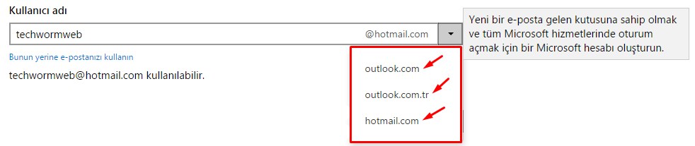 4- Kendinize uygun bir E-POSTA adresi belirledikten sonra uzantısının ne olmasını istiyorsanız onu seçin.