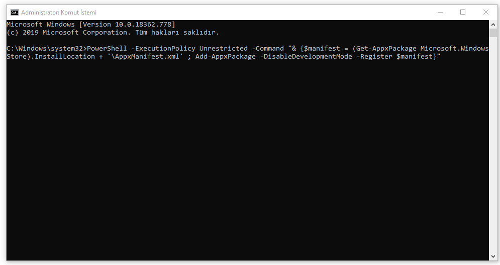 6- Alttaki indirme bağlantısından komutu kopyalayın ve arama kısmına “cmd” yazdıktan sonra üstte çıkan “Komut İstemi” seçeneğine SHİFT tuşuna basılı tuttuktan sonra fare ile sağ klik yapıp “Yönetici Olarak Çalıştır” diyelim. Gelen pencereye kopyaladığımız komutu yapıştırıp enter yapalım. Microsoft Mağazasına gidip, mağazanın çalışıp çalışmadığını kontrol edelim.