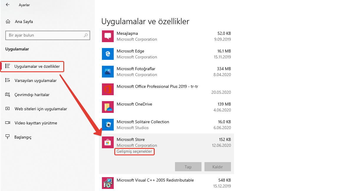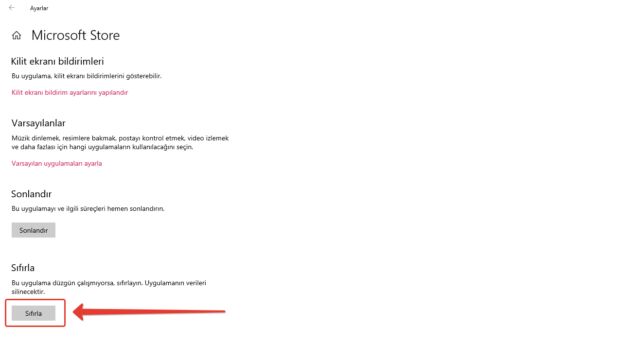 4- Eğer sorun devam ediyorsa dördüncü adımımıza geçiyoruz ve burada “Mağazayı Tamamen Sıfırlayacağız”. Bu işlem için sırasıyla Ayarlar | Uygulamalar ve Özellikler | Mağaza Uygulamasına Klikleyelim | Gelişmiş Seçenekler | Sıfırla diyelim. Microsoft Mağazasına gidip, mağazanın çalışıp çalışmadığını kontrol edelim.