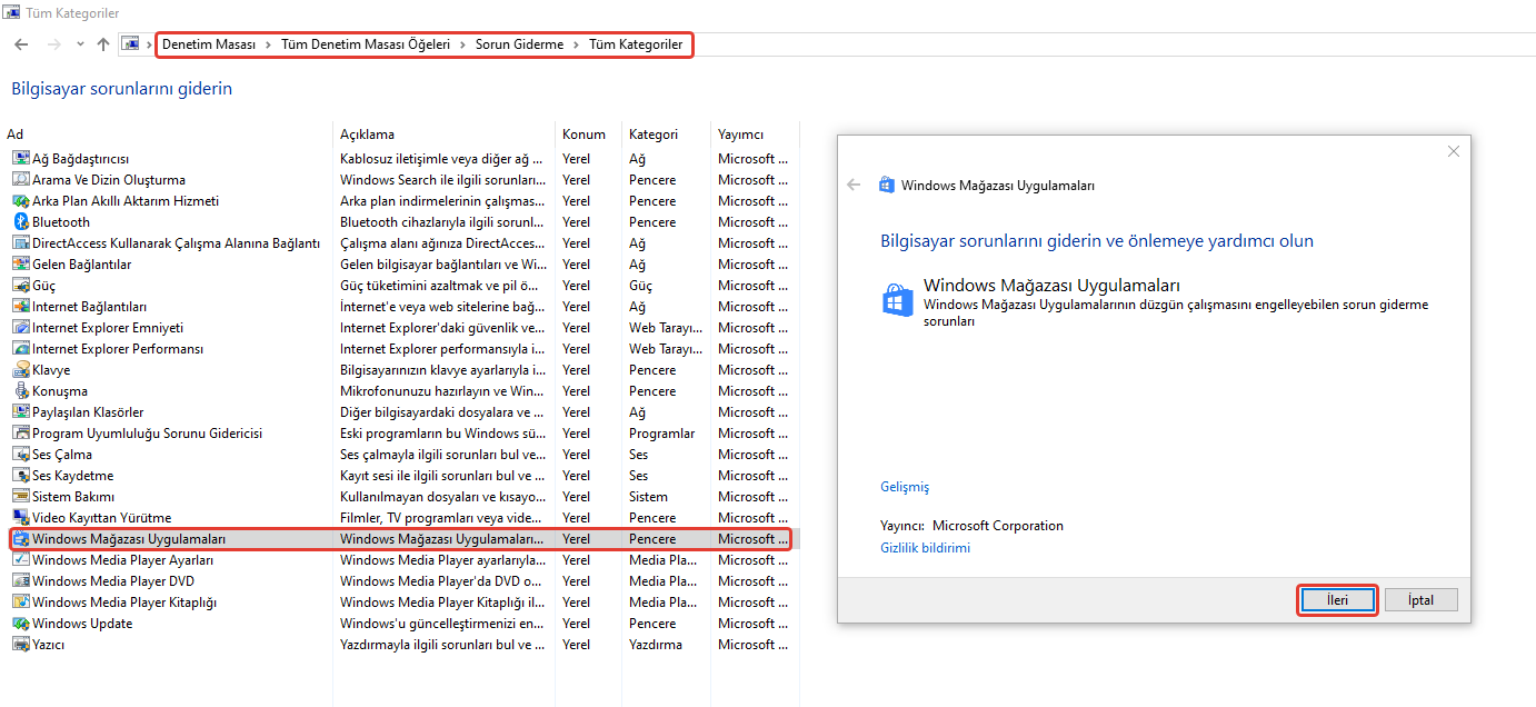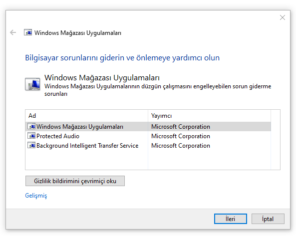 9- Son yöntemimizde ise buradan (tıkla) Microsoftun resmi sitesinden dosyayı indirelim. Ardından bu indirdiğimiz dosyayı çalıştıralım. Gelen pencereden sonra çözülecek sorunlar arasından Windows Mağazası Uygulamalarını seçip İleri diyelim. Sorun giderici sorunları bulduktan sonra otomatik olarak düzeltecektir.