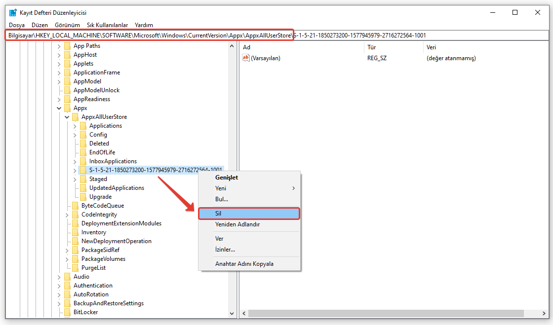 Appxalluserstore klasörünü açtıktan sonra her ihtimale karşı kullanıcı adımıza ait sid değerinin bir yedeğini alalım. Bunun için ilgili sid değerini sağ klikleyip “ver” diyelim. Yedeği masaüstüne kayıt edelim. Ardından bu sid değerinine ait klasörü sağ klikleyerek silelim ve bilgisayarımızı yeniden başlatalım. Bilgisayar yeniden başladıktan sonra Microsoft Mağazasına gidip, mağazanın çalışıp çalışmadığını kontrol edelim.