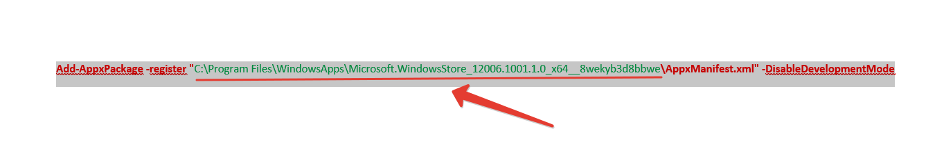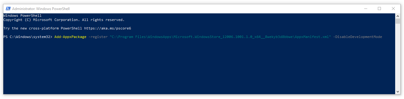 Add-AppxPackage -register “XXX\AppxManifest.xml” -DisableDevelopmentMode