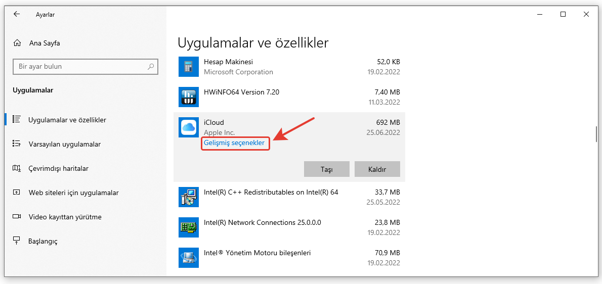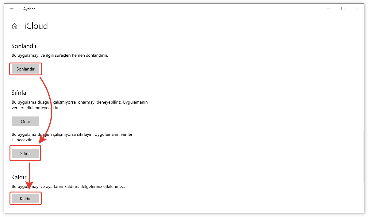 Not: Eğer hala silinmemekte ısrar eden uygulama varsa “Gelişmiş Seçenekleri” seçerek gelen pencereden “SONLANDIR, SIFIRLA, KALDIR” seçeneklerini seçerek uygulamayı bilgisayarınızdan tamamen kaldırabilirsiniz.