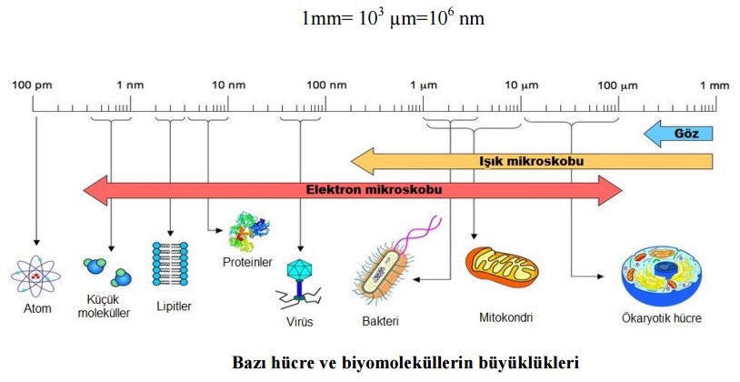 Mikroorganizmalar çok küçük canlılar olduklarından boyutlarını ifade ederken farklı ölçü birimleri kullanılır. Mikroorganizmaların büyüklüğü tanımlanırken bakteriler, funguslar, protozoa ve algler için mikrometre (μm), virüsler için ise nanometre (nm) birimleri kullanılmaktadır. Mikroorganizmalar büyüklüklerine göre; bakteri > virüs > defektif virüs > viroid > prion olarak sıralansa da bunlardan daha büyük olan protozoa, algler ve mantarlar ise kendi içlerinde değişik büyüklükte olabilir. Işık mikroskobu ile mikrometre boyutlu mikroorganizmalar gözlenebilirken nanometre boyutlu virüslerin gözlenebilmesi için büyütme gücü çok daha fazla olan elektron mikroskoplar kullanılmaktadır. Işık mikroskobu 1 ile 10.000 kat büyütme sağlayabilirken elektron mikroskobu ile 1.000.000 kattan fazla büyütme sağlanabilir. Mikroorganizmaların büyüklüklerini ifade eden ölçülerin dönüşümleri şu şekildedir: