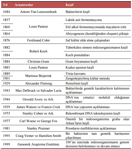 Bilim insanlarının mikrobiyoloji bilimine yaptıkları önemli katkılardan bazıları aşağıdaki tabloda verilmiştir.
