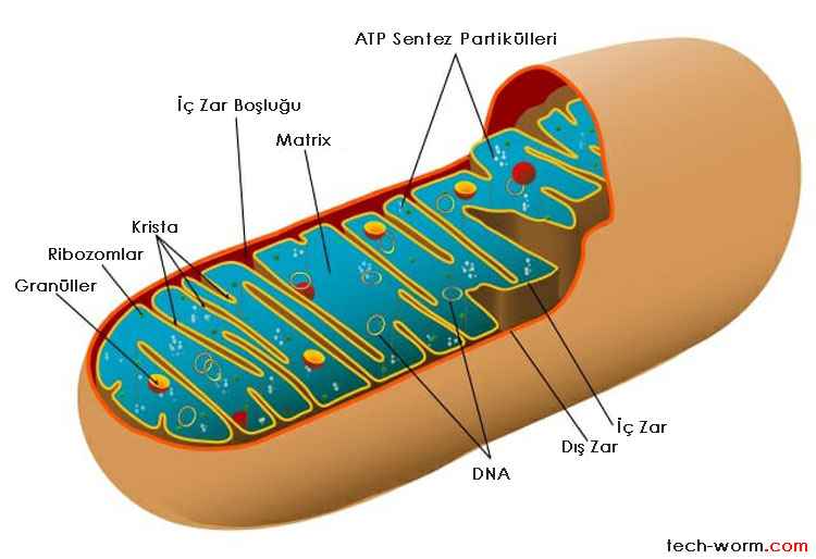 Hücrenin enerji merkezi mitokondride dört kısım vardır. Bu kısımlar dış zar, iç zar, zarlararası (periferal) bölge ve matriks’dir.