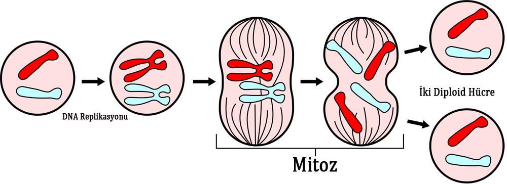 - Diploid (2n) kromozomlu 1 hücreden, Dipliod (2n) kromozomlu 2 hücre oluşur.
