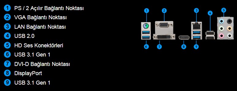 Anakart üzerinde yerleşik halde 1 adet PS/2 Combo Portu (fare ve klavye için), 4 adet USB 3.1 (Gen1), 2 adet 2.0 USB ve 1’er adet DVI-D, VGA ve DisplayPort görüyoruz. Küçük bir hatırlatma daha yapalım anakartan bilgisayar kasasına 8 adet USB 3.1 (Gen1) ve 6 adet USB 2.0 desteği bulunuyor.