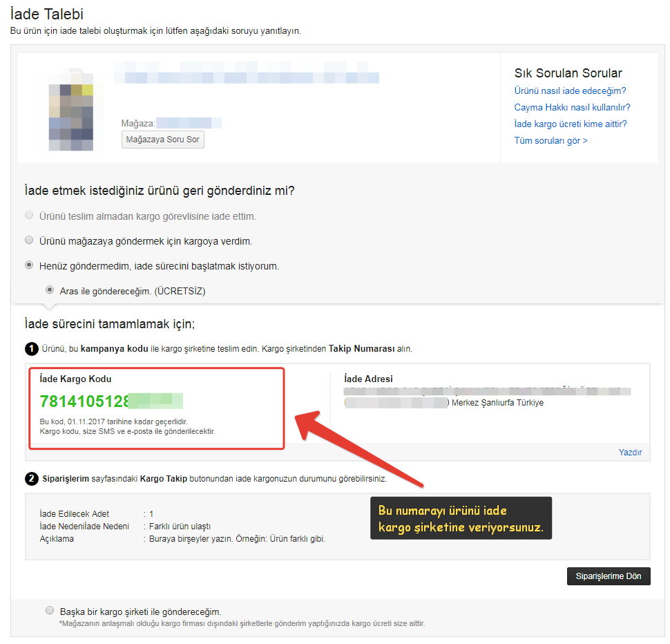 3- Yöntem: Henüz göndermedim, iade sürecini başlatmak istiyorum: Ürünü aldınız ve herhangi bir nedenle iade etmek istiyorsunuz. Bunun için iade talep edip ürünü, anlaşmalı kargo firmasıyla ücretsiz gönderebilirsiniz. Profilinizden MEVCUT SPARİŞ/SPARİŞLERİM ksımından Sipariş Detayını Gör sekmesini seçin ve Ürünü İade Et deyin. Açılan sekmeye “Henüz göndermedim, iade sürecini başlatmak istiyorum.” klikleyin ve ÜCRETSİZ yazan kargo firmasını seçtikten sonra sistem size İade Kargo Kodu verecektir. Ürün ile birlikte bu numarayı ilgili kargo firmasına verin. İşleminiz tamamdır.