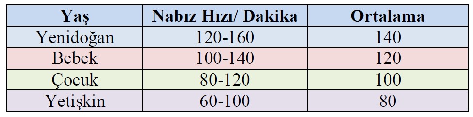 - Yaş: Nabız hızı, yenidoğan döneminden puberte ve erişkin dönemine doğru azalır. Yenidoğanlarda nabız sayısı, dakikada 120-160 atım iken yetişkinlerde 60-100 atımdır.