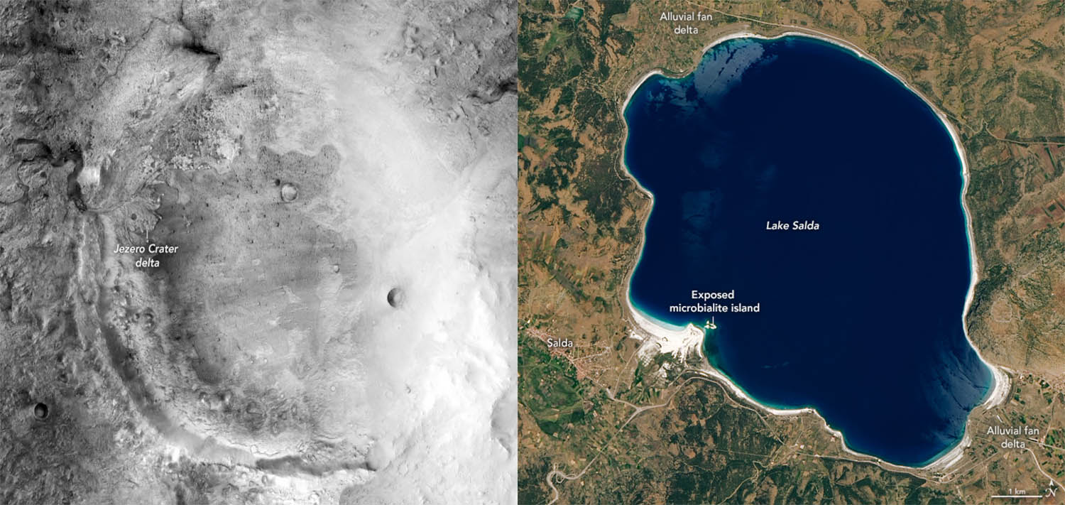 NASA Twitter‘dan Perseverance‘ın inceleme yapacağı kurumuş krater gölüyle Salda Gölü’nün yan yana fotoğraflarını yayımladı.