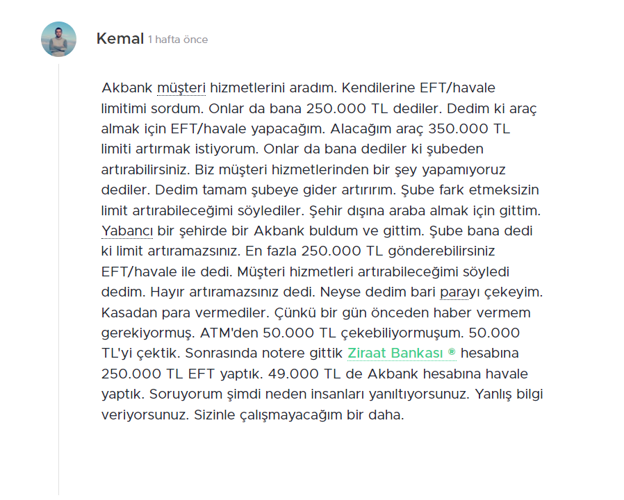 Hemen aşağıya benzer bir şikâyet bırakıyorum. Umarım banka bunu görür ve bir açıklama yapar.