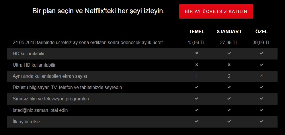 Netflix üyeliği üç farklı paketten oluşuyor. Paketlerin herhangi biri için (kredi kartı ile) üye olunduğunda ilk ay ücretsiz hizmet vermektedir. İstenildiği taktirde ilk ay süresi dolduğunda üyelik iptal edilebilmektedir. İlk üç paket için fiyat politikası Nisan 2018 itibariyle şöyledir;