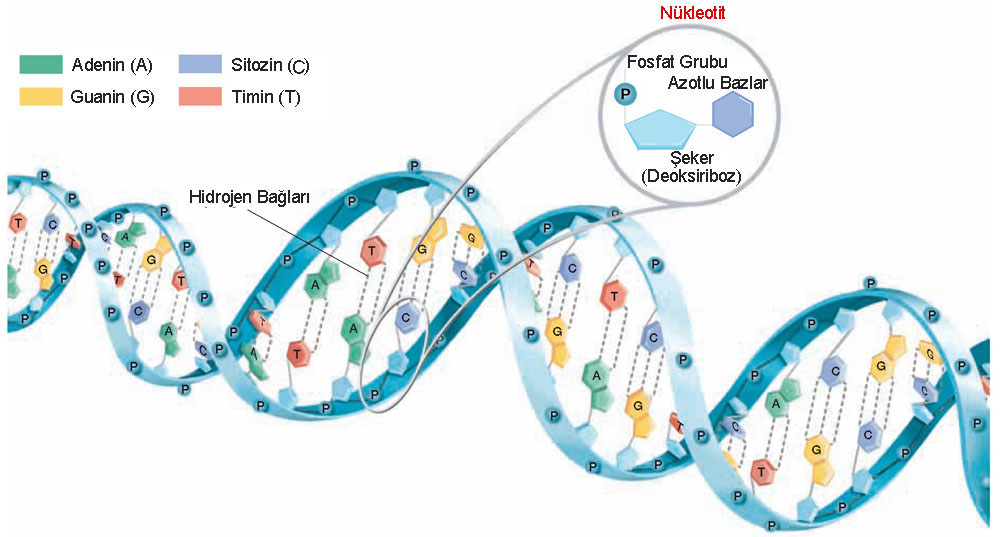 Azotlu organik bazlar; glikozit bağıyla beş karbonlu şekere bağlıdır. Bu yapıya nükleozit denir. Nükleozitler fosfodiester bağ ile fosfat grubuna bağlandığında nükleotitler oluşur. Benzer yapı ATP‘de de vardır.