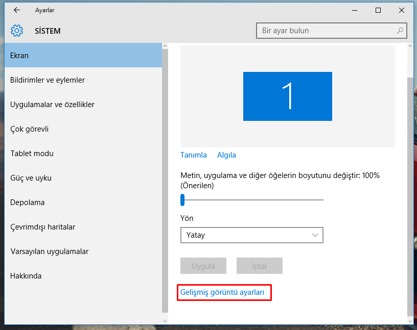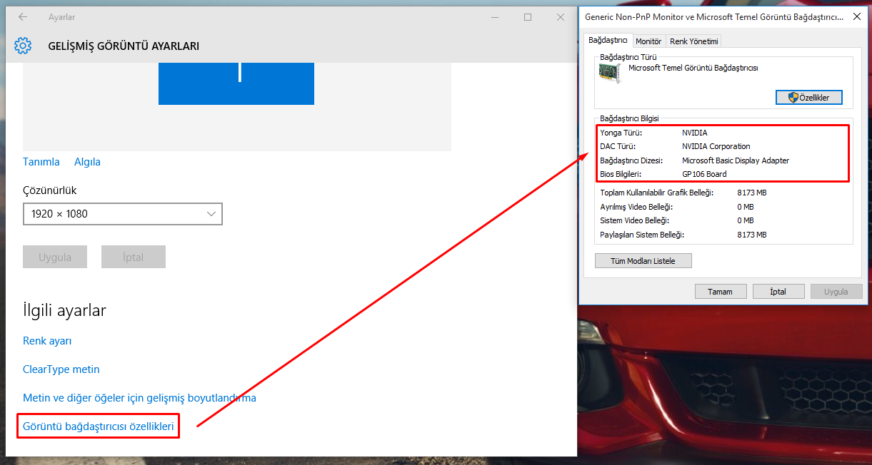 Windows 10 içinse yapmanız gereken aynı şekilde masaüstünde sağ klikleyin açılan panelde Görüntü Ayarları dedikten sonra Gelişmiş Görüntü Ayarları dediğinizde karşınıza çıkan pancerede Görüntü Bağdaştırıcısı Özelliklerine klikleyin böylece ekran kartınıza ait bilgiler gelecektir.
