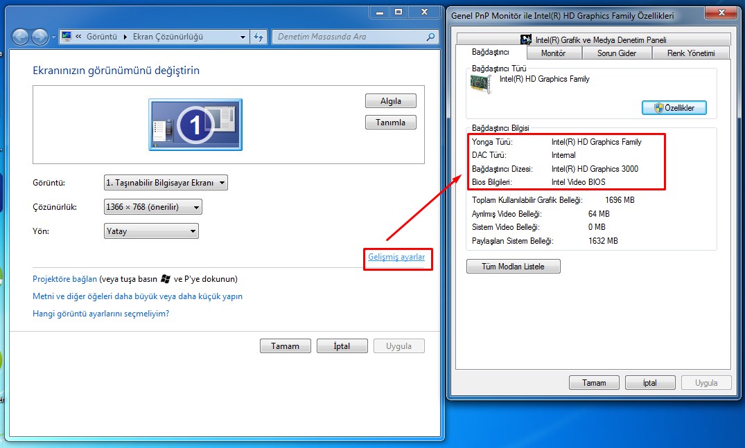 Ekran Kartı driverinin yüklenip yüklenmediğini anlamın birden çok yolu var. Ancak basit bir yolla bunu öğrenebilirsiniz. Windows 7 için masaüstünde sağ klikleyin açılan pencerede Ekran Çözünürlüğü dedikten sonra açılan pencerede Gelişmiş Ayarlar dediğinizde karşınıza ekran kartınıza ait bilgiler gelecektir.