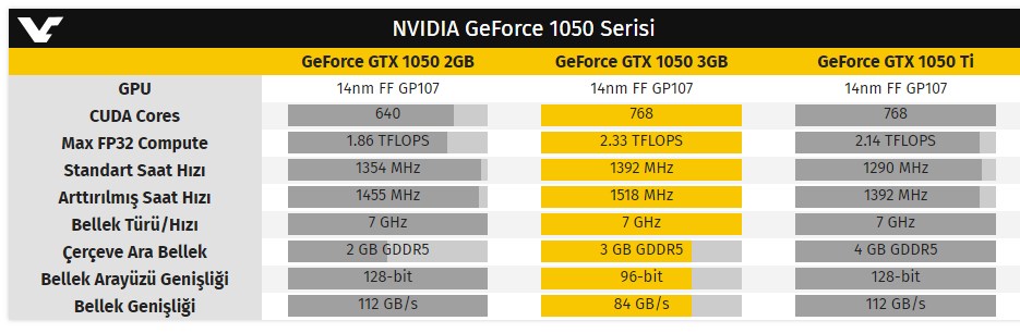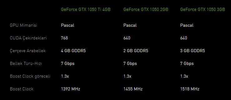 Nvidia’nın GTX 1050 3GB modelini; GeForce GTX 1050Ti modeli ile karşılaştırdığımızda ikisininde aynı değerde Nvidia Cuda Cores özelliğine sahip olduğunu görüyoruz. CUDA, Nvidia’nın GPU (grafik işlem birimi) gücünü kullanarak hesaplama performansında büyük ölçüde artışlara olanak veren paralel hesaplama mimarisi olduğunu hatırlatalım. GTX 1050 3GB modeli 1392 Mhz Standart Saat Hızı, 1518 Arttırılmış Saat Hızı ile GeForce GTX 1050Ti’nin önüne geçiyor. Ancak Standart Bellek Konfigrasyonu 1 GB azaltılara 3 GB’a indirgenmiş. Yine Bellek Arayüzü Genişliğinin 128 Bit’ten 96 Bit’e indirgenmiş olduğunu görüyoruz.