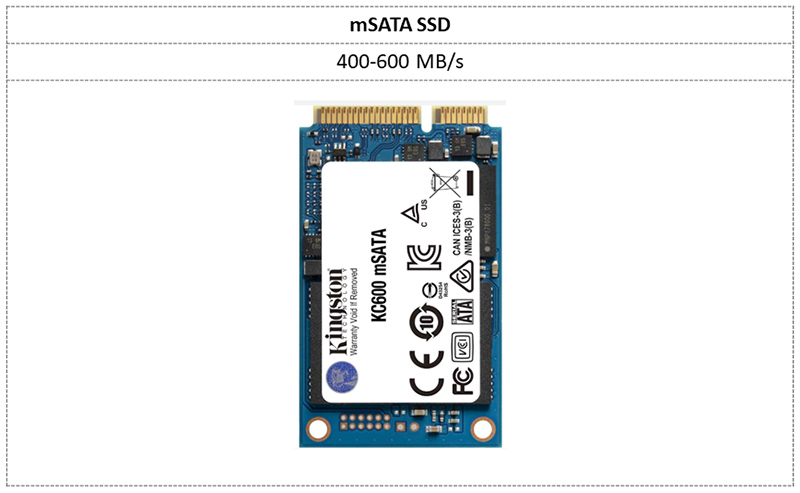 mSATA AHCI SSD: mSATA veya diğer adıyla mini SATA SSD, Serial ATA (SATA) International Organization (SATA Uluslararası Organizasyonu) tarafından geliştirilen, mSATA ara yüzünü kullanan bir veri depolama birimidir. Mobil aygıtlardaki Katı Hal Sürücüler (SSD’ler) için geliştirilmiş SATA arabiriminin bir sürümüdür. mSATA, Mini PCI Express (mPCIe) ile aynı soketi kullanır; ancak elektriksel sinyalleşme farklıdır. (mSATA, MicroSATA’yı değil mini-SATA‘yı ifade eder.) Günümüzde M.2 SSD‘ler mSATA‘nın yerini almıştır. mSATA, bir yandan veri yolu bağlantı ara yüzünü tanımlarken, bir yandan da elektronik parçaların uygulandığı PCB kart açısından 30mm x 50.95 mm ebatlarına işaret eden yeni bir form faktörüdür. Bu iki tipte mSATA SSD’ler SATA veriyolunu kullandığı için saniyede maksimum 600 MB okuma/yazma hızına ulaşabilir.