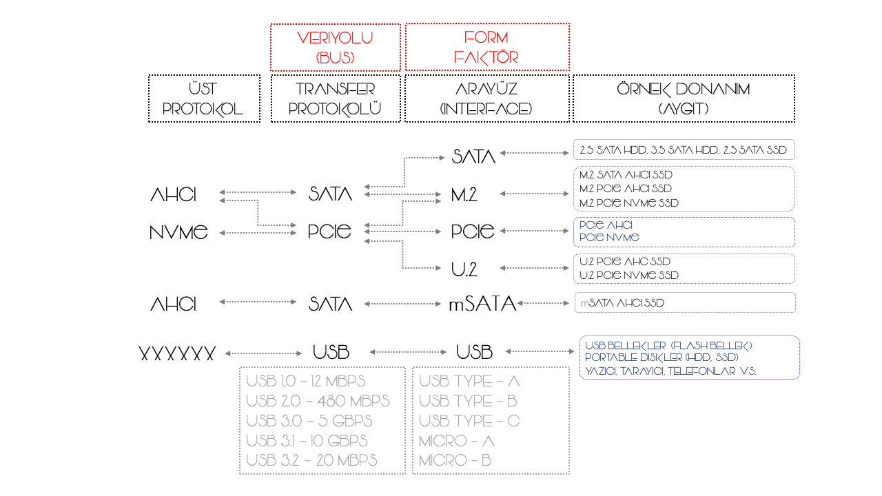 Merhaba Arkadaşlar. Bu yazımızda herhangi bir donanım birimi aldığınızda karşınıza çıkan bazı teknik kavramlar ile ilgili bilgi vermeye çalışacağım. Böylece aldığınız donanım biriminin ne olduğu ne işe yaradığı, hangi sisteme uyumlu olduğu veya okuma/yazma hızı gibi bilgilere net bir şekilde sahip olacaksınız. Donanım birimi dediğimizde karşımıza birçok farklı aygıt çıkıyor. Örneğin HDD, SSD, USB Bellek gibi aygıtlar birer depolama birimi. Bu depolama birimlerinde NVMe, SATA, PCIe, AHCI, M.2, U.2, mSATA gibi birçok farklı kavram çıkıyor. Bu kavramlar çoğu zaman kafa karışıklığı oluşturabiliyor. Bende bu konuyu olabildiğince sade ve basit bir şekilde ifade etmeye çalışacağım. Yine sorularınız olursa yorum kısmından sorabilirsiniz. Elimden geldiğince cevap vermeye çalışırım.