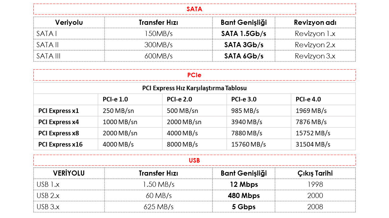 Depolama birimi kavramı kullanıldığında anakart üzerinde SATA, PCIe, USB gibi veri yolları bulunuyor. Bu her veriyolunun kendine göre bir veri transfer hızı bulunuyor.