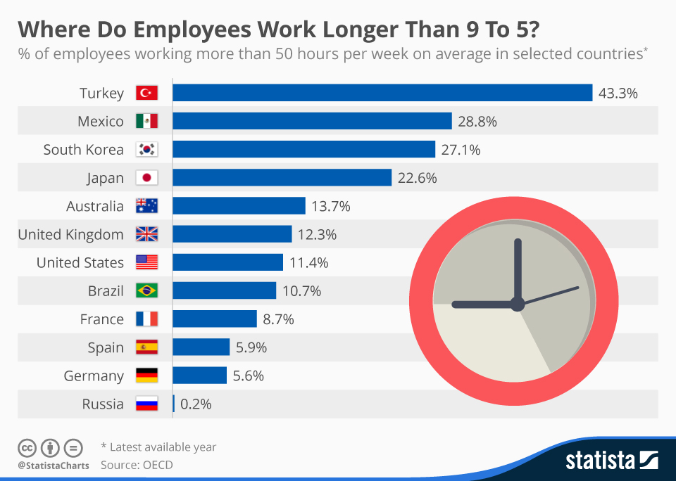 OECD verilerine göre “haftalık 60 saat ve üzerinde en çok çalışan ülkeler” aşağıdaki gibi listelenmiştir. Bu listeye göre Türkiye‘deki çalışanların %23.3‘ü haftalık 60 saat ve üzerinde çalışan kişilerden oluşuyor. Ardından %22,6 ile Güney Kore geliyor. En son OECD refah verilerine göre OECD ortalaması yüzde 5.6 olarak değerlendirildiğinde Litvanya, Letonya, Estonya, Norveç, İsviçre, İsveç yüzdelik olarak en az çalışma saatine sahip ülkeler arasında görülüyor.