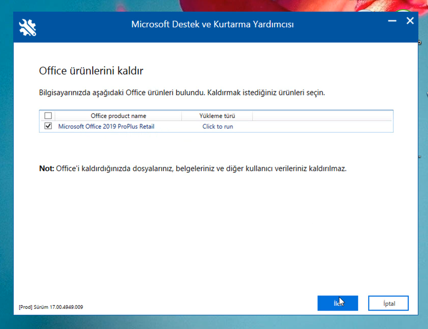 4- Devamında bilgisayarınızda bulunan ofis uygulamaları listelenecektir. Burada kaldırmak istediğiniz ofiste uygulamasını seçin ve ileri deyin.