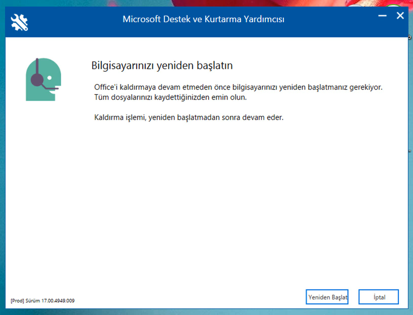 6- Bilgisayarınızdan Microsoft Office kaldırma işlemi tamamlandığında son olarak bilgisayarınızı yeniden başlatmanız gerekiyor. Ekranda yeniden başlat seçeneğini seçiyoruz. Bilgisayarımızı yeniden başlattıktan sonra Microsoft Office bilgisayarımızdan tamamen kaldırılmış olacak. Benim Anlatacaklarım bu kadar. Herhangi bir sorunuz varsa bana yorum kısmından iletebilirsiniz. Ayrıca Microsoft Office uygulamasını tamamen nasıl sileceğinizi alttaki videodan da izleyerek öğrenebilirsiniz.