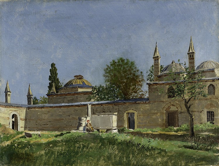 Tabloda 16. yüzyılda Çoban Mustafa Paşa tarafından Mimar Sinan’a yaptırılan Gebze’deki Çoban Mustafa Paşa Külliyesi resmedilmiştir. Külliyede yer alan cami kubbe ve minareleri görülmektedir. Külliye, bir camiyle birlikte bir imarethane ve medrese de içerir. Ayrıca külliyede türbeler, tekke, kütüphane, dârüşşifâ, paşa odaları, kervansaray ve hamam da bulunur.[2] Çoban Mustafa Paşa Kapucubaşı görevinde bulunmuş, Kanuni Sultan Süleyman’ın kız kardeşi Hafsa Sultan ile evlenmiştir. Belgrad ve Rodos seferlerine katılmıştır. 1529’da Viyana seferine gitmek üzere iken öldü. Cenazesi, Gebze’de Çoban Mustafa Paşa Külliyesi’ndeki türbesine defnedildi. Osman Hamdi Bey de Çoban Mustafa Paşa Külliyesi ve türbesini resmetmiştir. Gebze için çok özel bir yere sahip Çoban Mustafa Paşa Külliyesi gerek döneminin önemli bir eseri olması açısından, gerekse Gebze’yi çok seven Osman Hamdi Bey için güzel bir manzara olması açısından resmedilmeye değer bir nitelik kazanmıştır.