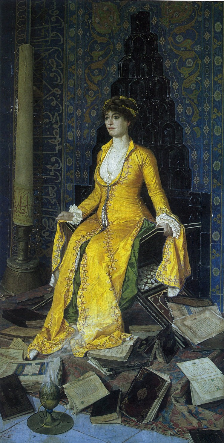 Eserde altın sarısı bir atlas kumaşının önünde genç bir kadın durmaktadır. Kadın, o dönemin Paris modasına uygun bir kıyafet giymiştir. Kıyafeti aynı zamanda Osmanlı kadınının giyim tarzıyla da uyuşmakta ve bu yönüyle oryantalist bir eğilime işaret etmektedir. Genç kadın, yüzünü yarı-saydam bir peçe ile gizlemektedir. Ayrıca kadının sol eli de siyah elbisenin içinde gizlenmiştir. Klasik Osmanlı ve Selçuklu halılarına özgü geometrik motifler, eserde belirgin bir şekilde çizilmiştir.
