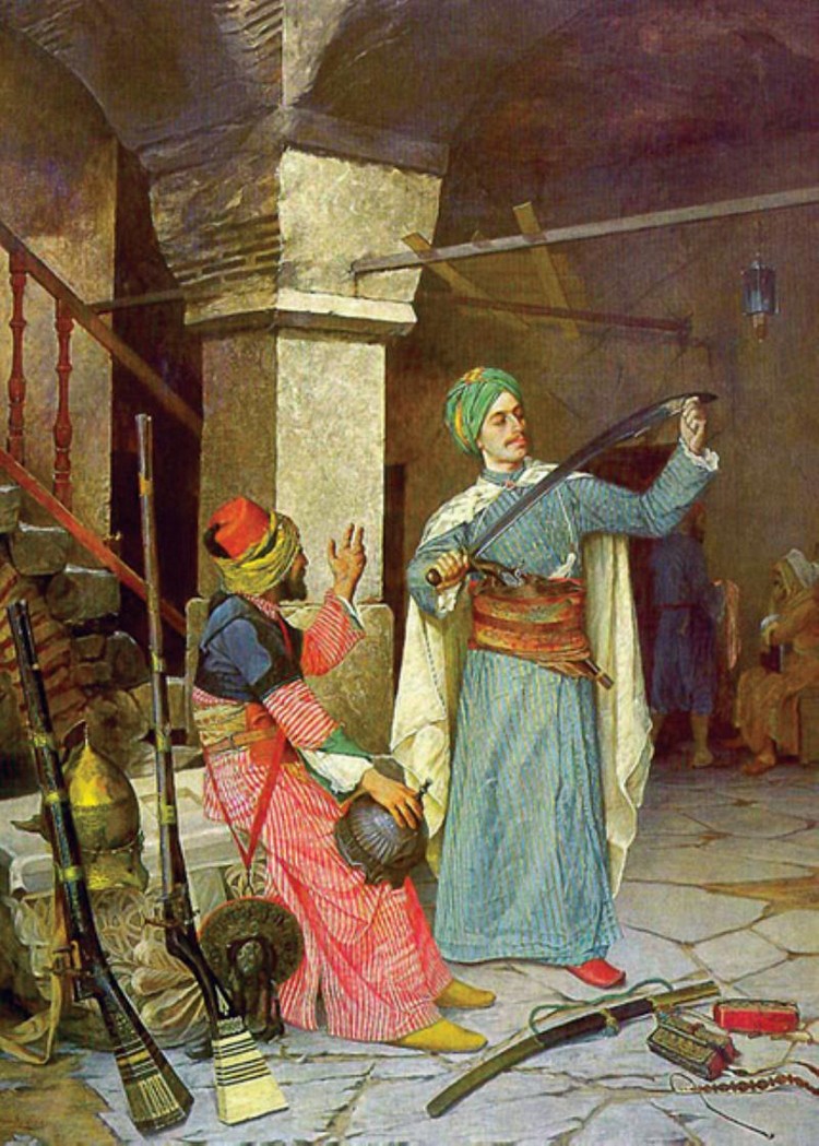 Kendisini (iki kişi olarak) ve oğlunu bir arada daha eski bir devrin giysileri içinde resmettiği bir yapıttır. Osman Hamdi, kendisini bir sütun başlığı üstünde oturur şekilde resmetmiştir. Üzerinde oturduğu sütun başlığı ile müze kuruculuğuna gönderme yaptığı düşünülmüştür. El jesti, oğluna öğüt vermekte olduğu şeklinde yorumlanır. Oğlu ise kınından çektiği kılıcı incelerken resmedilmiştir ve gençliği temsil eder. Giydikleri farklı başlıklar ve birinin otururken diğerinin ayakta, birinin silahları bırakmışken diğerinin silahla gösterilmesinin kuşak farkını anlattığı şeklinde yorumlanır. Arka planda ise bir elinde kitap tutan yaşlı bir adam ile ona bez parçası uzatan bir bezirgan görülür.