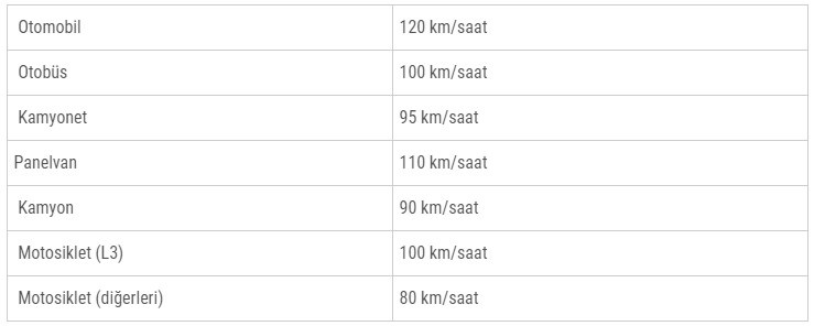 Diğer araçların şehir dışı, şehir içi ve otoyollardaki hız sınırlarına buradaki Karayolları Genel Müdürlüğü resmi web sitesinden bakabilirsiniz.